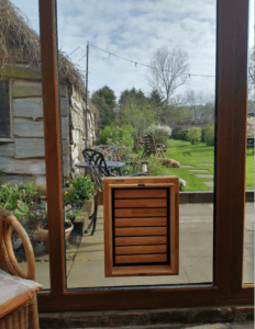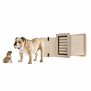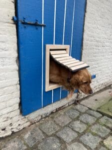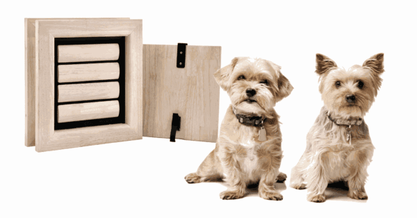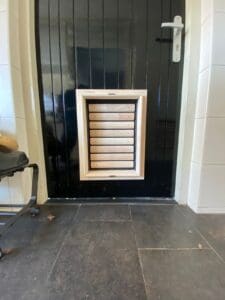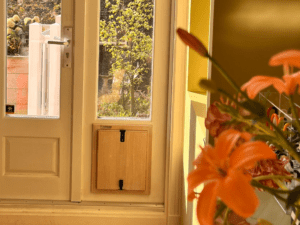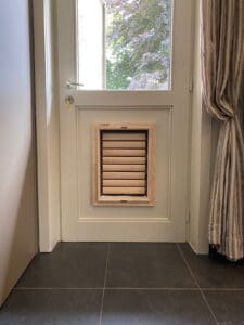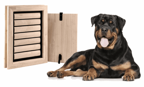 D’une beauté spectaculaire, une chatière pour chien en bois installée dans la vitre d’une porte ou d’une fenêtre. Pas facile à organiser, mais nous vous aidons volontiers !